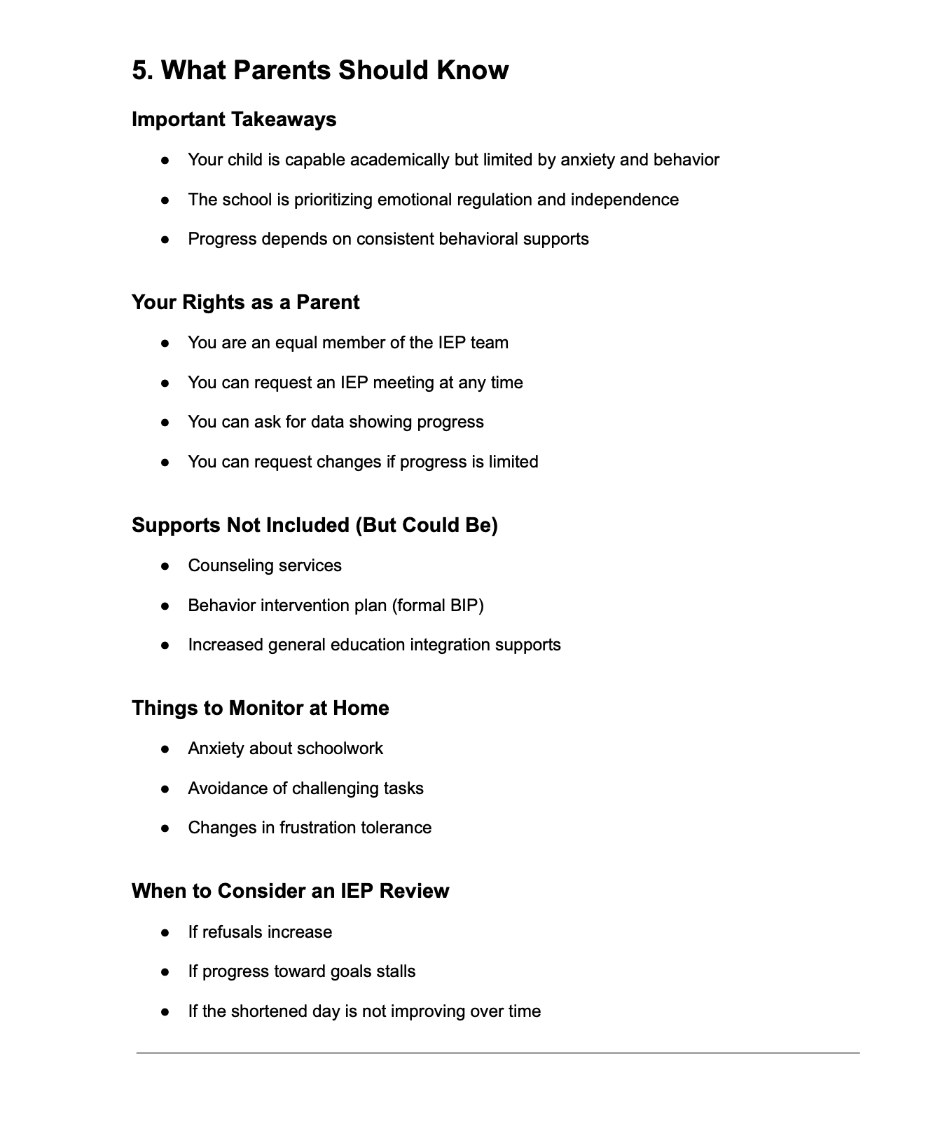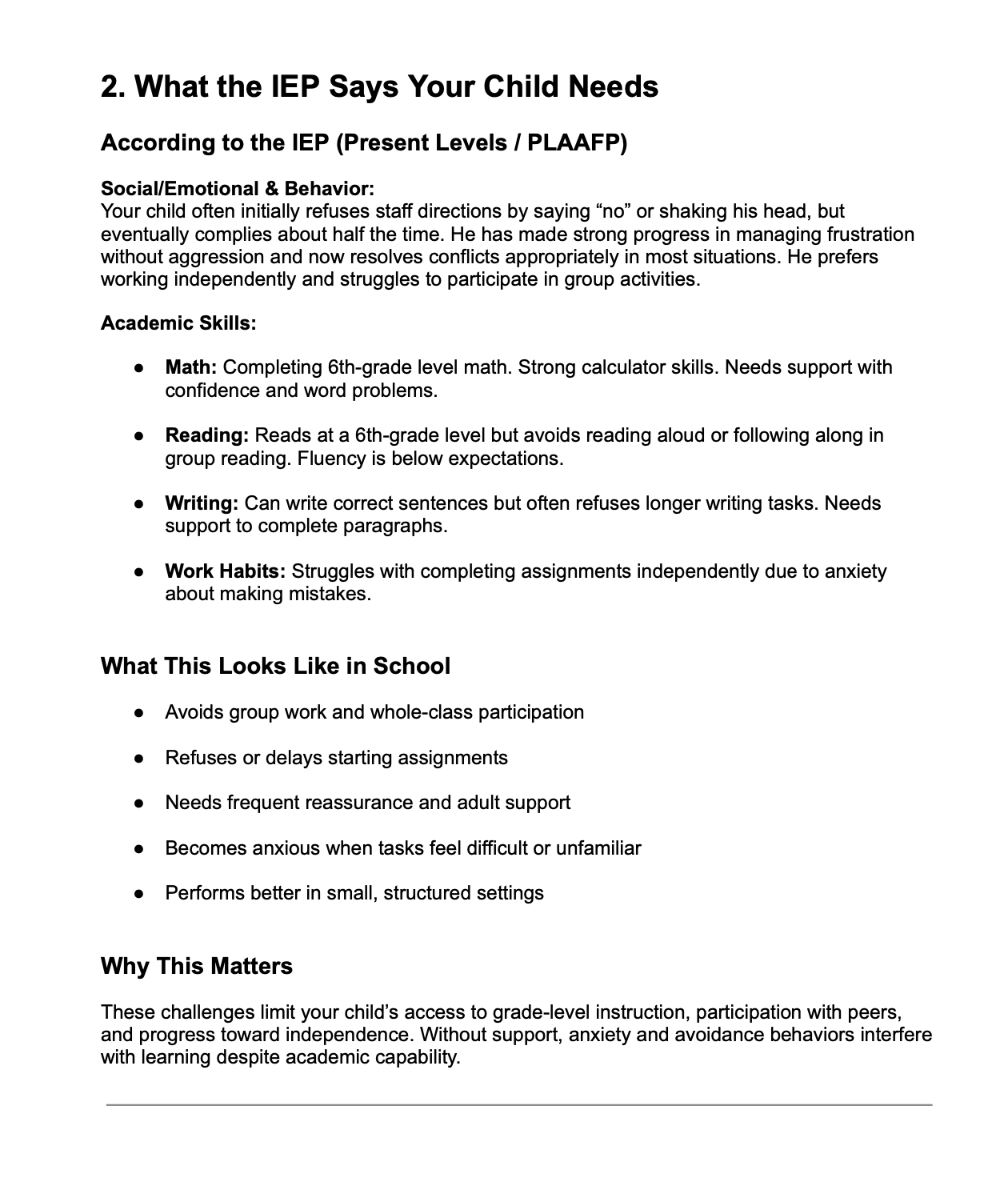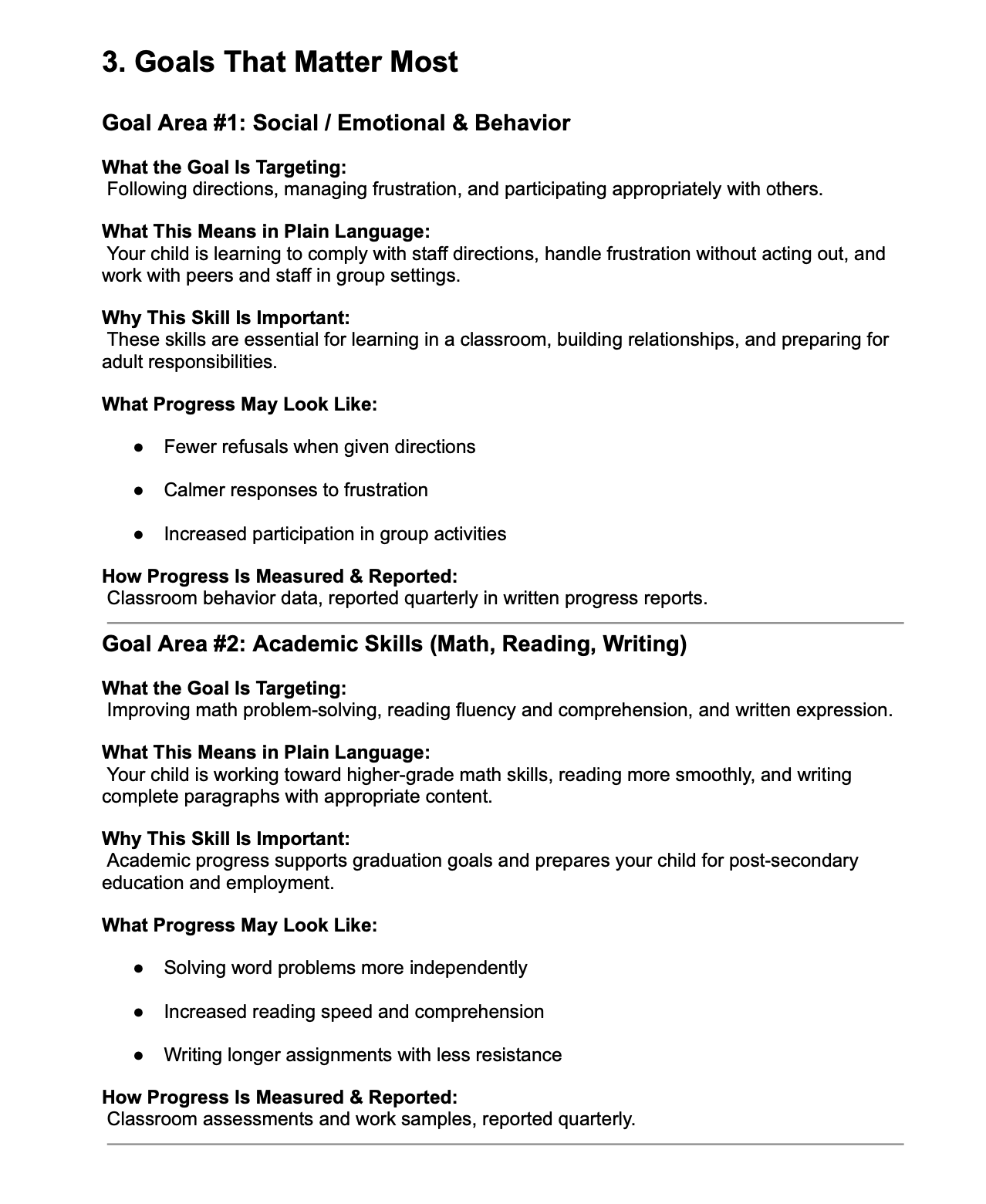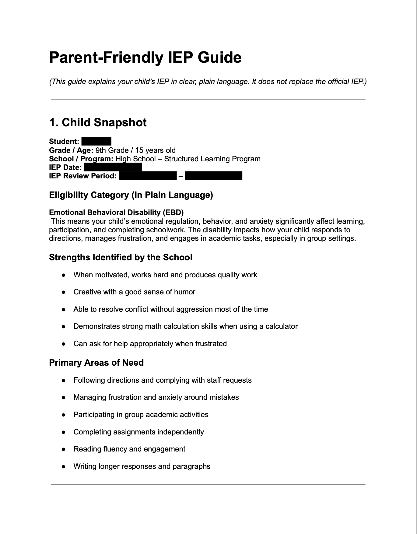 Below is a sample of how we organize and explain IEP information in a clearer, parent-friendly format.